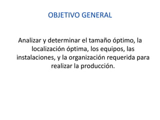 El documento analiza los factores a considerar para establecer un área de producción, incluyendo la determinación del tamaño y localización óptimos, los equipos e instalaciones requeridos, y la organización necesaria. Explica métodos para seleccionar la mejor alternativa de localización y analiza aspectos como la macro y microlocalización, así como consideraciones ambientales.
