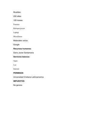El documento describe un estudio técnico sobre un taller de capacitación para estudiantes de derecho que se llevará a cabo en la Universidad Cristiana Latinoamericana en Ambato. El taller utilizará diapositivas, videos y material didáctico para enseñar a los estudiantes cómo tratar a los clientes. Contará con un auditorio de 250 personas, computadoras, retroproyector y otros equipos. Los competidores son otros estudiantes de derecho y de otras facultades.