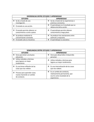 El documento compara el estudio y el aprendizaje, destacando sus semejanzas y diferencias. Entre las diferencias señala que el estudio se da a través de la investigación y permite obtener conocimiento a corto plazo, mientras que el aprendizaje se da a través de la experiencia y permite obtener conocimiento a largo plazo. También destaca que entre las semejanzas ambos sirven para desarrollarse personalmente y utilizan métodos y técnicas para mejorar el rendimiento.