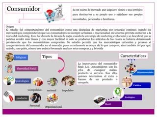 El documento define y describe las diferencias entre consumidor, cliente, comprador y usuario. Un consumidor es quien adquiere bienes o servicios para uso personal o familiar, mientras que un cliente puede ser una persona o empresa que adquiere bienes o servicios aunque no sea el consumidor final. Un comprador realiza compras cubriendo necesidades y adquiriendo bienes, y un usuario es para quien se crean los productos o servicios, siendo el objeto del diseño. Cada uno tiene un papel diferenciado en el escenario comercial.