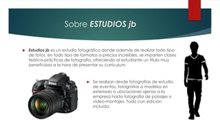Este documento resume los servicios de fotografía ofrecidos por Estudios JAVIER BECERRIL GÓMEZ. El estudio ofrece una amplia gama de servicios fotográficos a precios asequibles e imparte clases de fotografía. Cuenta con equipamiento y recursos avanzados, como cámaras réflex de alta calidad, iluminación profesional y salas de edición. El estudio está abierto de lunes a sábado y ofrece precios flexibles según el tipo de sesión fotográfica solicitada