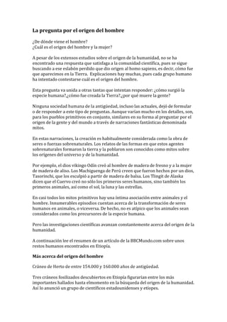 Este documento explora las diferentes explicaciones sobre el origen de la humanidad, incluyendo mitos primitivos y las investigaciones científicas más recientes. Se describe el descubrimiento de tres cráneos fosilizados datados en 160,000 años en Etiopía, que podrían ser los restos humanos modernos más antiguos encontrados. Estos cráneos apoyan la teoría de que la humanidad surgió por primera vez en África y luego migró a otras partes del mundo.