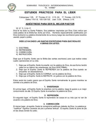 Este documento proporciona instrucciones para el estudio bíblico dirigido por el Espíritu Santo, con el objetivo de que los líderes sean capacitados a través de la Palabra de Dios. Explica que la Biblia fue inspirada por Dios para enseñar, reprender, corregir e instruir, y que el Espíritu Santo usa las Escrituras para guiar en la fe, la obediencia y la justicia. Además, provee principios para interpretar correctamente la Biblia, como considerar el contexto,