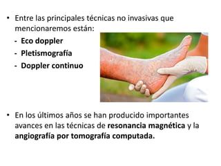 Este documento describe diversas técnicas no invasivas para estudios venosos diagnósticos como el eco doppler, la pletismografía y el doppler continuo. También describe avances recientes en resonancia magnética y angiografía por tomografía computada. Explica el uso del eco doppler, la pletismografía, el doppler continuo, la angioTAC y la angioRM para evaluar venas y diagnosticar trombosis venosa profunda u otras condiciones venosas.