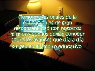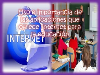 Este documento discute la importancia del uso de aplicaciones de Internet en la educación. Señala que los avances tecnológicos han apoyado la transformación educativa y que las nuevas tecnologías como Internet permiten estar a la vanguardia de las demandas de una sociedad globalizada. Plantea la pregunta de si se está haciendo un uso adecuado de Internet en los procesos educativos y concluye que los profesionales de la educación deben estar a la vanguardia de las nuevas tecnologías y saber usarlas de forma apropiada en la en