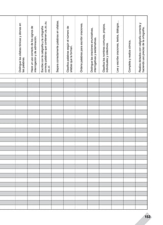 Este documento proporciona una lista de habilidades de lectura y escritura que los estudiantes deben desarrollar. Incluye objetivos como leer, escuchar y comprender diferentes tipos de textos; reconocer letras, vocales y consonantes; escribir con caligrafía y ortografía correctas; y utilizar signos de puntuación adecuadamente. También menciona habilidades como clasificar palabras y reconocer familias léxicas, formar palabras derivadas y distinguir entre diferentes tipos de oraciones y verbos.