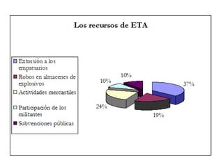 Este documento resume la situación actual de la organización terrorista ETA. Describe cómo su financiación se ha reducido a un tercio y cómo existen divisiones internas sobre continuar con la violencia. Explica las posiciones de diferentes gobiernos españoles frente a ETA y cómo el apoyo social a la organización ha disminuido drásticamente debido a su radicalización y violencia. Finalmente, concluye que cincuenta años de conflicto han cambiado considerablemente a ETA.