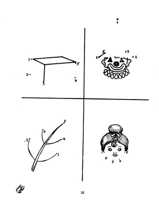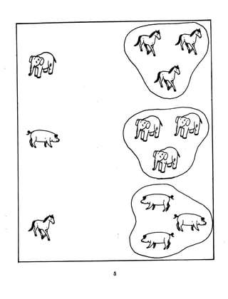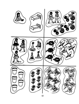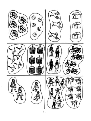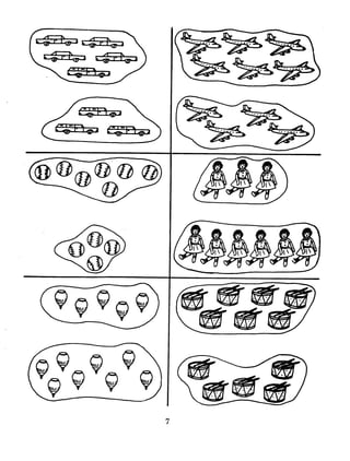 El documento contiene una prueba de matemáticas para niños con diferentes ejercicios: 1) encerrar en círculos los números que representan conjuntos de ilustraciones, 2) trazar líneas desde los números al centro a las ilustraciones correspondientes, 3) completar números faltantes, 4) dictado de números, 5) lectura de números.