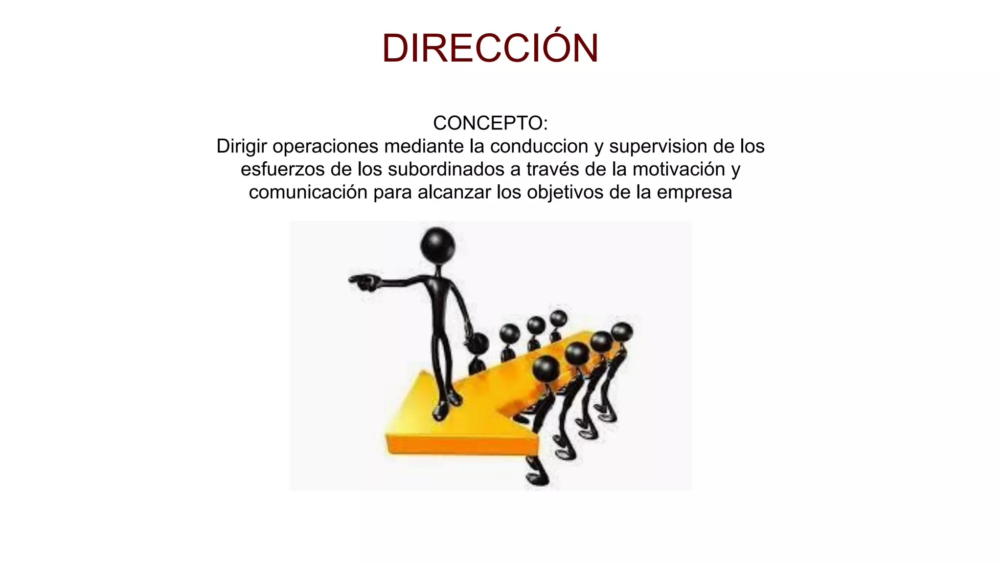 El documento describe los principales conceptos relacionados con la dirección de una empresa. Explica que la dirección implica motivar y comunicarse con los subordinados para alcanzar los objetivos de la empresa. También describe los principios básicos de la dirección como la coordinación de intereses, la supervisión directa y la resolución de conflictos. Además, explica que la toma de decisiones, la integración de recursos, la motivación y la comunicación son elementos clave de la dirección.