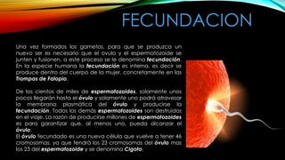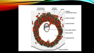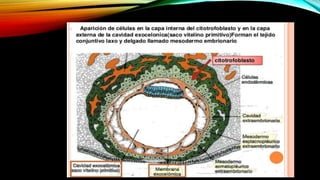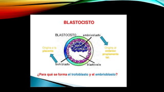 El documento describe el proceso de fecundación, inicio del desarrollo embrionario y etapas clave en la formación del embrión humano, incluyendo la segmentación y gastrulación. Se detallan las transformaciones desde el cigoto hasta el blastocisto y la posterior implantación en el endometrio. Además, se explica la formación de las tres capas germinales y la notocorda durante las primeras semanas del desarrollo embrionario.