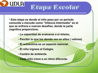 La etapa escolar comprende entre los 6 y 11 años, donde el niño experimenta cambios físicos, cognitivos y psicosociales. Físicamente mejora la coordinación y control muscular, así como la motricidad gruesa y fina. Cognitivamente desarrolla la capacidad de autoevaluarse y entender la perspectiva de los demás. Psicosocialmente se vuelve más independiente y sociable, buscando la aprobación de sus pares.