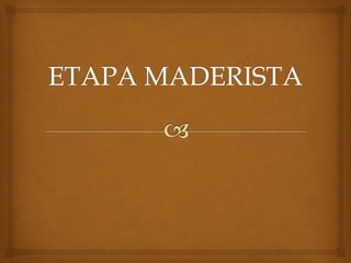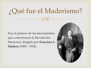 El maderismo fue el primer movimiento de la Revolución Mexicana, liderado por Francisco I. Madero entre 1909 y 1910, cuyo objetivo principal era regenerar la democracia mediante el sufragio efectivo y la no reelección de funcionarios. La insurrección comenzó con el Plan de San Luis, que convocó a un levantamiento armado el 20 de noviembre de 1910 para derrocar el régimen de Díaz y restituir tierras a los campesinos. A pesar de su éxito inicial, los maderistas se enfrentaron a la oposición de diversos grupos y eventualmente se disolvieron, dando paso a una lucha por diferentes ideales políticos en el país.