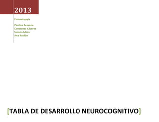 Este documento presenta una tabla sobre el desarrollo neuromotor y cognitivo del feto y bebé desde la primera semana de embarazo hasta los nueve meses. Detalla las características físicas, motrices y cognitivas que se van desarrollando en cada mes, así como actividades recomendadas para la madre durante el embarazo como ejercicio, alimentación y cuidados de la piel.