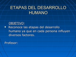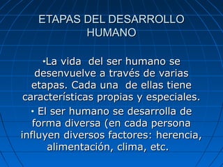 Las etapas del desarrollo humano incluyen la pre-natal, la infancia, la niñez, la adolescencia, la juventud y la adultez. Cada etapa tiene características físicas y psicológicas propias y el desarrollo varía de persona a persona debido a factores como la herencia y el ambiente.