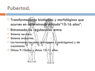 Este documento describe los cambios físicos y psicológicos que ocurren durante la adolescencia. Explica que la pubertad comienza entre los 10-16 años y trae cambios hormonales y de desarrollo de los órganos sexuales. Los cambios físicos son más rápidos en los hombres que en las mujeres y varían entre las distintas etapas de la adolescencia. Psicológicamente, los adolescentes desarrollan su identidad e imagen corporal durante este periodo de grandes transformaciones.