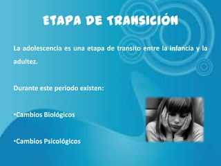 La adolescencia es una etapa de transición entre la infancia y la adultez marcada por cambios biológicos y psicológicos. Biológicamente, se producen cambios hormonales que desencadenan el desarrollo de los caracteres sexuales primarios y secundarios. Psicológicamente, los adolescentes buscan afirmar su identidad, independizarse de sus padres y desarrollan un pensamiento más formal. Esta etapa también se caracteriza por crisis como la búsqueda de autonomía y la formación de su propio sistema de creencias.