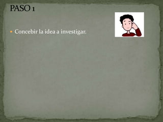 El documento describe las etapas típicas para realizar una investigación, incluyendo concebir la idea, establecer objetivos y preguntas de investigación, revisar literatura relevante, desarrollar un marco teórico, establecer hipótesis y variables, seleccionar un diseño metodológico, analizar datos, y elaborar un informe escrito para defender los resultados de la investigación.