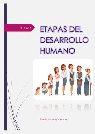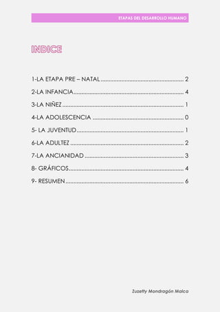 El documento describe las diferentes etapas del desarrollo humano, incluyendo la etapa pre-natal, la infancia, la niñez, la adolescencia, la juventud, la adultez y la ancianidad. Cada etapa se caracteriza por cambios físicos, cognitivos y psicológicos específicos. Además, el documento incluye tablas y gráficos sobre el desarrollo motor en la etapa pre-natal y sobre el porcentaje de mujeres casadas entre las edades de 15 a 44 años.