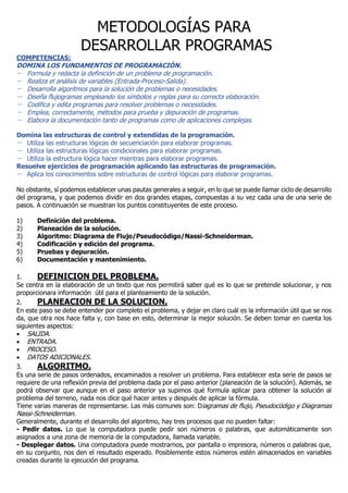 El documento describe los principales métodos y etapas para desarrollar programas, incluyendo la definición del problema, el diseño de algoritmos, la codificación, pruebas y documentación. Explica estructuras de programación como secuenciación, condicionales y bucles. También cubre temas como diagramas de flujo, pseudocódigo, orientación a objetos y diferentes modelos de programación.