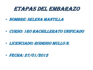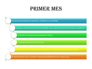 El documento describe las distintas etapas del embarazo a lo largo de nueve meses, incluyendo los cambios físicos que experimenta el feto y su desarrollo de los principales órganos y sistemas. En el primer mes, se forman las extremidades y los órganos principales, y en el segundo mes los órganos ya funcionan y se forman las orejas y dedos. Para el tercer mes, el feto mide aproximadamente 10 cm y puede oírse su corazón, y para el noveno mes está listo para nacer.