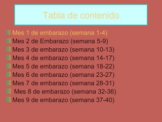 Este documento describe las diferentes etapas del embarazo divididas en 9 meses. Cada mes se detalla el desarrollo del feto incluyendo cambios en el tamaño, peso y sistemas orgánicos. También se describen los posibles síntomas que experimenta la madre como náuseas y cansancio. El documento concluye explicando que en los últimos meses el feto se desarrolla completamente y está listo para nacer en cualquier momento, mientras se prepara para la lactancia y la vida fuera del útero.