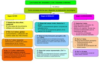 Las tres teorías describen etapas similares en el desarrollo del esquema corporal del niño. Vayer propone 4 etapas que van desde la dependencia materna hasta los 2 años hasta la elaboración definitiva del esquema corporal entre los 7 y 11 años. Le Boulch describe 3 etapas que incluyen el cuerpo vivido hasta los 3 años, la discriminación perceptiva entre 3 y 7 años, y el cuerpo representado de 7 a 12 años. Ajuriaguerra también propone 3 etapas que abarcan el cuerpo vivenciado hasta los 3 años, la discriminación