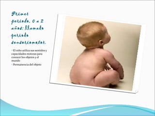 El documento resume los cuatro periodos del desarrollo cognitivo infantil según Piaget: el periodo sensoriomotor (0-2 años), el periodo preoperacional (2-6 años), el periodo de las operaciones concretas (7-11 años), y el periodo de las operaciones formales (12 años en adelante).