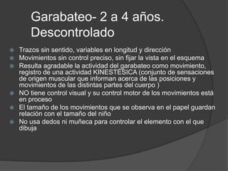 El documento describe las etapas del desarrollo del dibujo infantil. En la etapa de garabateo (2-4 años), los trazos son descontrolados y carecen de sentido. Entre los 3-4 años, los niños comienzan a darle nombre a sus garabatos. En la etapa preesquemática (4-7 años), los niños logran símbolos y crean formas reconocibles como figuras humanas simples.