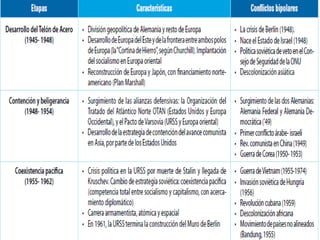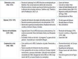 Durante la Guerra Fría, Estados Unidos y la Unión Soviética compitieron de forma indirecta a través de la carrera armamentista y espacial, así como mediante la formación de alianzas militares y de inteligencia. La URSS lanzó el primer satélite Sputnik en 1957, iniciando la carrera espacial, mientras que ambas potencias aumentaron considerablemente los gastos militares y desarrollaron armas nucleares a pesar de conferencias para limitar su producción.