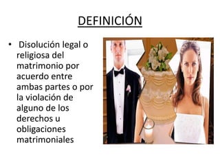 El documento describe las etapas del proceso de divorcio, incluyendo la definición, separación, shock, negación, caos emocional, aceptación, recuperación, y las clases de divorcio como mutuo acuerdo, separación de hecho y causal. Explica cada etapa del proceso emocional y legal de disolver un matrimonio.