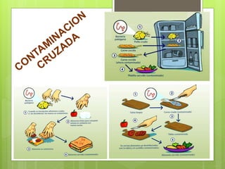 Este documento proporciona recomendaciones para garantizar la inocuidad de los alimentos a lo largo de toda la cadena alimentaria, incluyendo la elección, preparación, almacenamiento y conservación de los alimentos. Se enfatiza la importancia de mantener la higiene, separar los alimentos crudos de los cocidos, cocinar completamente los alimentos, y mantener las temperaturas adecuadas para evitar la multiplicación de bacterias. El documento también ofrece pautas específicas para la selección de diferentes tipos de alimentos como frutas,