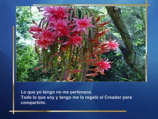 Este documento ofrece reflexiones sobre la vida y las relaciones con los demás. Enfatiza que todo lo que tenemos y somos nos fue dado por el Creador para compartirlo, y que nadie entra en nuestras vidas por casualidad. También enfatiza la importancia de aprender de experiencias positivas y negativas, aceptar lo que nos ocurre, pensar bien de los demás y buscar su bienestar, perdonarnos a nosotros mismos, y vivir con alegría, amor y paz.