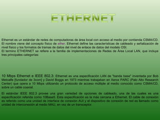 Ethernet es un estándar de redes de área local que opera a velocidades de 10, 100 y 1000 Mbps sobre diferentes medios como cable coaxial, par trenzado o fibra óptica. Utiliza el método de acceso CSMA/CD donde las estaciones escuchan el medio antes de transmitir para evitar colisiones. Las tramas Ethernet incluyen campos para las direcciones MAC de origen y destino, tipo de protocolo y secuencia de comprobación de errores.