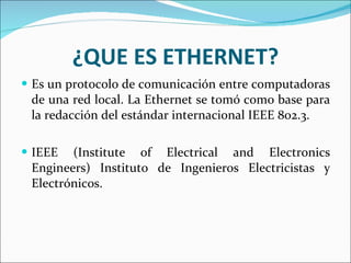 Este documento describe Ethernet, un protocolo de comunicación para redes locales que se basa en el estándar IEEE 802.3. Explica que Ethernet utiliza el protocolo CSMA/CD para detectar colisiones y transmitir datos, y describe los componentes clave de una trama Ethernet como la dirección MAC, longitud de datos y secuencia de verificación. También resume las diferentes velocidades de Ethernet, como 10 Mbps, 100 Mbps y 1 Gbps, y cómo los conmutadores Ethernet modernos negocian automáticamente la velocidad y modo de transmisión con cada dispositivo.