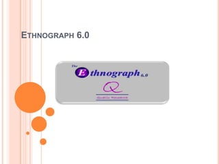 Este documento describe las funciones básicas del programa Ethnograph, el cual permite realizar análisis cualitativo de datos como texto, imágenes, videos y audio. Fue creado en 1985 por John Seidel para facilitar las tareas del investigador en el análisis de datos cualitativos. El documento explica cómo asignar documentos, crear códigos, buscar códigos, ver la frecuencia de códigos y relacionar códigos dentro del programa.