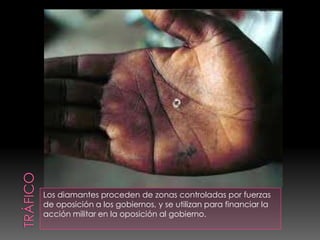 El documento habla sobre los diamantes ilegales que provienen de zonas controladas por fuerzas de oposición y se utilizan para financiar acciones militares contra los gobiernos, lo que causa esclavitud y el exilio de familias. También menciona que Taylor fue acusado de crímenes de guerra y contra la humanidad durante la guerra civil de Sierra Leona.