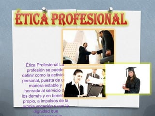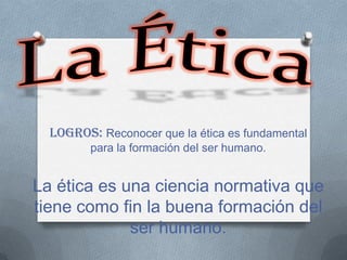 El documento describe diferentes tipos de ética, incluyendo la ética familiar, laboral, profesional, social, normativa, aplicada y cristiana. Define la ética como una ciencia normativa que busca formar al ser humano de manera adecuada. Explica que la ética familiar se basa en las relaciones entre miembros de una familia, mientras que la ética laboral guía el comportamiento profesional. También cubre conceptos como la ética social, que considera las responsabilidades hacia los demás, y la ética normativa, que describe lo que debería