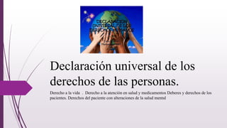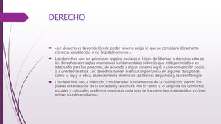 Este documento describe los derechos fundamentales relacionados con la salud, incluidos el derecho a la vida, el derecho a la atención médica y los medicamentos, y los derechos de los pacientes. Define el derecho a la salud y sus elementos esenciales como la disponibilidad y accesibilidad de servicios de salud para todos. También explica los tres tipos de derechos - derechos naturales, morales y legales - y sus características. Finalmente, establece límites al derecho a la vida, como la legítima defensa