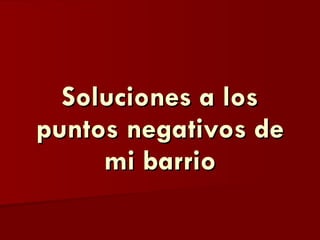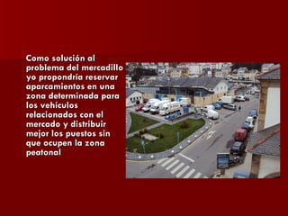 El documento propone tres soluciones a problemas en un barrio: 1) Reservar aparcamientos para vehículos del mercado y distribuir mejor los puestos para solucionar problemas con el mercadillo. 2) Hacer que las campanas de iglesia no suenen tan tarde o temprano para solucionar problemas con el ruido. 3) Hacer que una rula emita sonidos para espantar gaviotas cuando saque pescado para solucionar problemas con las gaviotas.