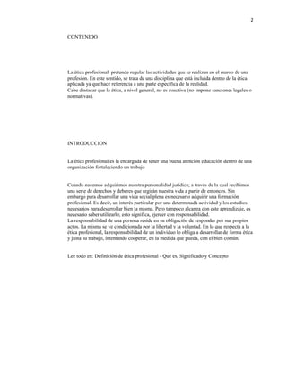 Este documento habla sobre la ética profesional. Define la ética profesional como la actividad de una persona al servicio de los demás de manera honorable y con dignidad. Explica que la ética profesional regula las actividades de una profesión y busca el bien común. También menciona que los profesionales deben mantener una buena capacidad intelectual y moral para desempeñar bien su trabajo de manera responsable y ética.