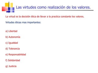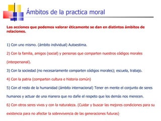 Las acciones que podemos valorar éticamente ocurren en diferentes ámbitos de relaciones, incluyendo con uno mismo, la familia y amigos, la sociedad, la patria, el resto de la humanidad y otros seres vivos. Las virtudes éticas más importantes son la libertad, autonomía, igualdad, tolerancia, responsabilidad, solidaridad y justicia.