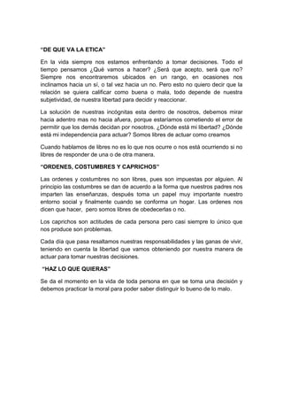Este documento trata sobre la ética y cómo aplicarla en la vida cotidiana. Explica que la ética estudia conceptos como la moral, el deber y la felicidad. Argumenta que debemos tomar nuestras propias decisiones basadas en nuestra conciencia y no dejar que otros decidan por nosotros. También enfatiza la importancia de ponerse en el lugar de los demás para comprender sus perspectivas.