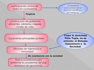 Este documento propone la creación de conciencia y difusión del conocimiento basado en los lineamientos de la UNESCO para integrar conocimientos, habilidades y actitudes que permitan revertir la situación mundial. Promueve programas de alfabetización científica para que los ciudadanos conozcan los avances científicos y tecnológicos y participen activamente, lo que propiciará la construcción de gobiernos más eficientes y mejores niveles de vida. Los jóvenes son considerados actores principales que difund