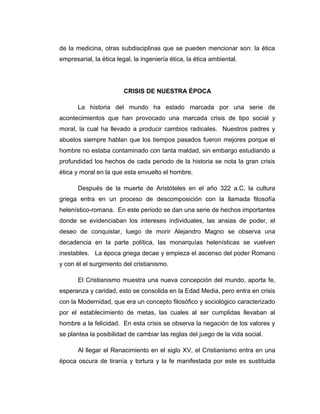 La ética aplicada estudia acciones morales concretas y controversias como el aborto, la eutanasia y la pena de muerte. Se apoya en ciencias como la psicología y la sociología para entender mejor los comportamientos humanos. Existen varias subdisciplinas como la bioética y la ética empresarial que estudian problemas éticos específicos. A lo largo de la historia, varios períodos como la antigua Grecia, la Edad Media y la época moderna han experimentado crisis éticas y sociales que han llevado a cambios