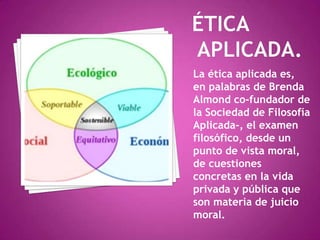 Este documento discute la ética aplicada y la ética profesional. La ética aplicada examina cuestiones morales en áreas como la bioética, la ética empresarial y la ingeniería ética. La ética profesional incluye normas para guiar las prácticas y relaciones dentro de una profesión. La formación ética profesional busca desarrollar conocimiento y habilidades para servir a la comunidad. La ética sugiere lo deseable mientras que la deontología establece reglas para garantizar que una profesión se ejer