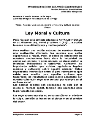 Este documento resume el discurso de Antanas Mockus sobre la relación entre la ley, la moral y la cultura. Argumenta que (1) la acción humana está regulada por motivos múltiples y normas legales, morales y culturales, y (2) los individuos deben armonizar estos tres sistemas de regulación para evitar contradicciones y encontrar el equilibrio entre la ley, la moral y la cultura.