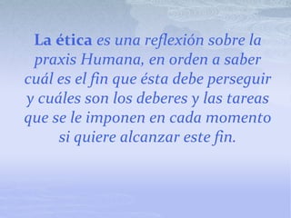 Este documento discute varios temas relacionados con la ética incluyendo la naturaleza de la ética, la libertad humana, los objetivos y fundamentos de la ética, la ética social y la ética individual, y la relación entre la ética y la política y el derecho. Explora conceptos como la legitimidad del estado y la participación ciudadana.