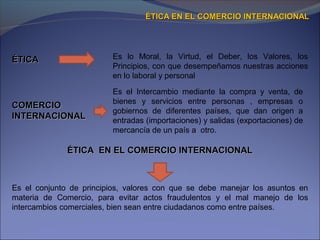 El documento trata sobre la ética en el comercio internacional. Explica conceptos como comercio internacional, prácticas desleales como el dumping y subsidios, y la importancia de que los profesionales del comercio internacional actúen con valores como la honestidad, justicia y responsabilidad. También describe la legislación venezolana para prevenir prácticas desleales y la entidad responsable de investigarlas.