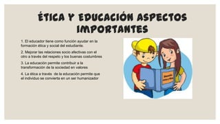 El documento describe la importancia de la ética en la educación. Señala que los educadores deben ayudar a formar a los estudiantes ética y socialmente a través del respeto y los buenos valores. Además, la educación permite transformar a la sociedad y ayudar a los individuos a convertirse en seres humanizadores. Por lo tanto, la escuela está comprometida a ofrecer una formación humana integral a los estudiantes y los maestros juegan un papel fundamental en la creación de valores éticos en los estudiantes.