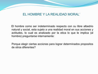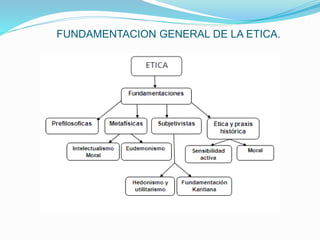 Este documento discute diferentes enfoques para fundamentar la ética. Explica que la ética busca determinar los bienes auténticos del hombre y por qué debe ajustarse a ellos. Luego describe fundamentaciones prefilosóficas basadas en costumbres sociales, fundamentaciones metafísicas derivadas del conocimiento de la realidad y fundamentaciones subjetivistas que ubican a la conciencia individual como la única fuente de la moral.